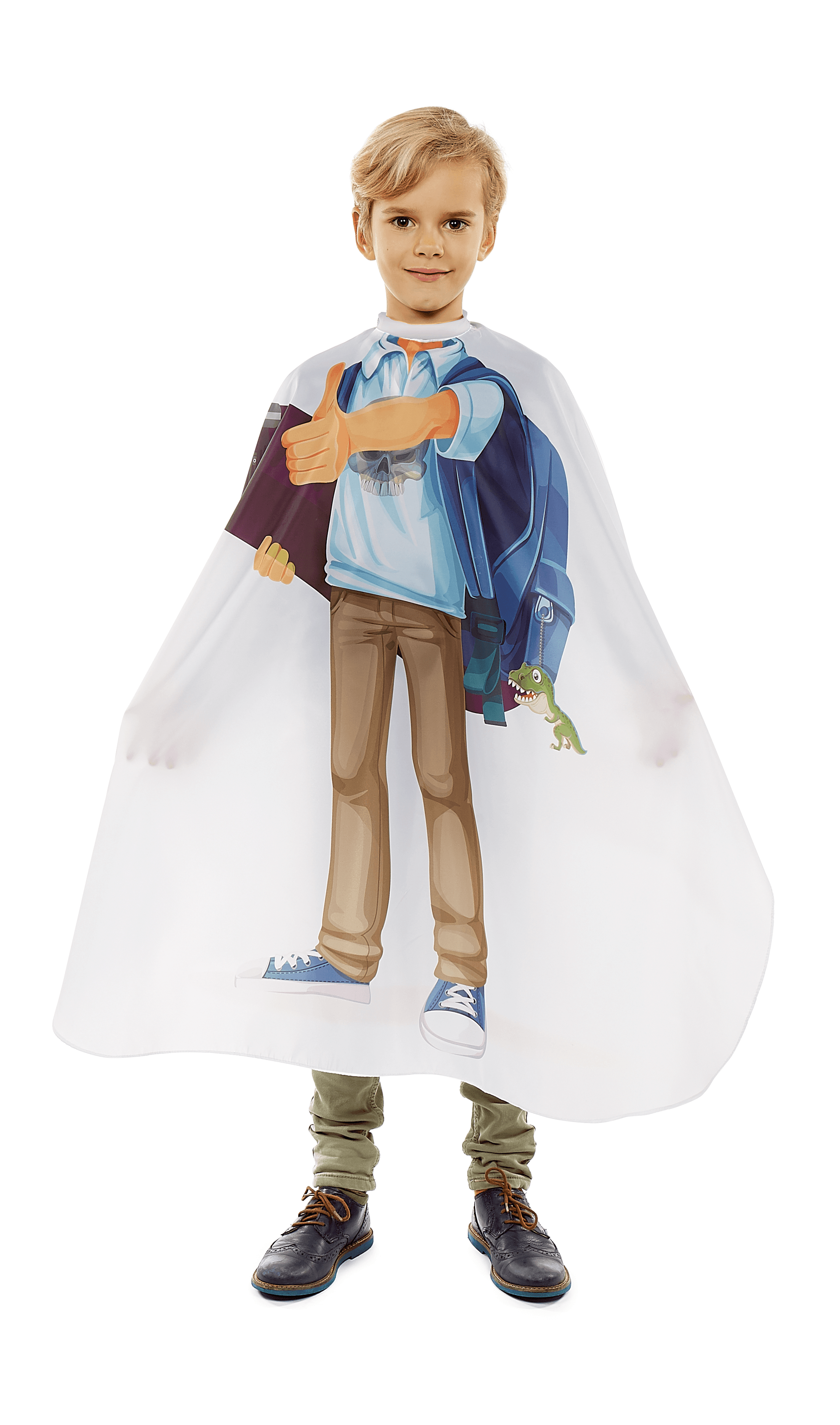 Vaikams skirtas kirpyklos apsiaustas su užtrauktuku ir kilpiniu užsegimu. Pagamintas iš 100 % poliesterio, orui laidžios medžiagos, kuri nepraleidžia vandens ir yra lengvai prižiūrima.