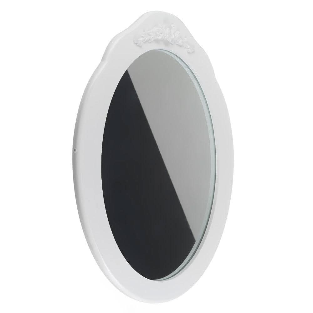 Veidrodis nuo kosmetinio staliuko MIRA / ELSA su dekoracija ant balto rėmo, skirtas kabinti ant sienos.