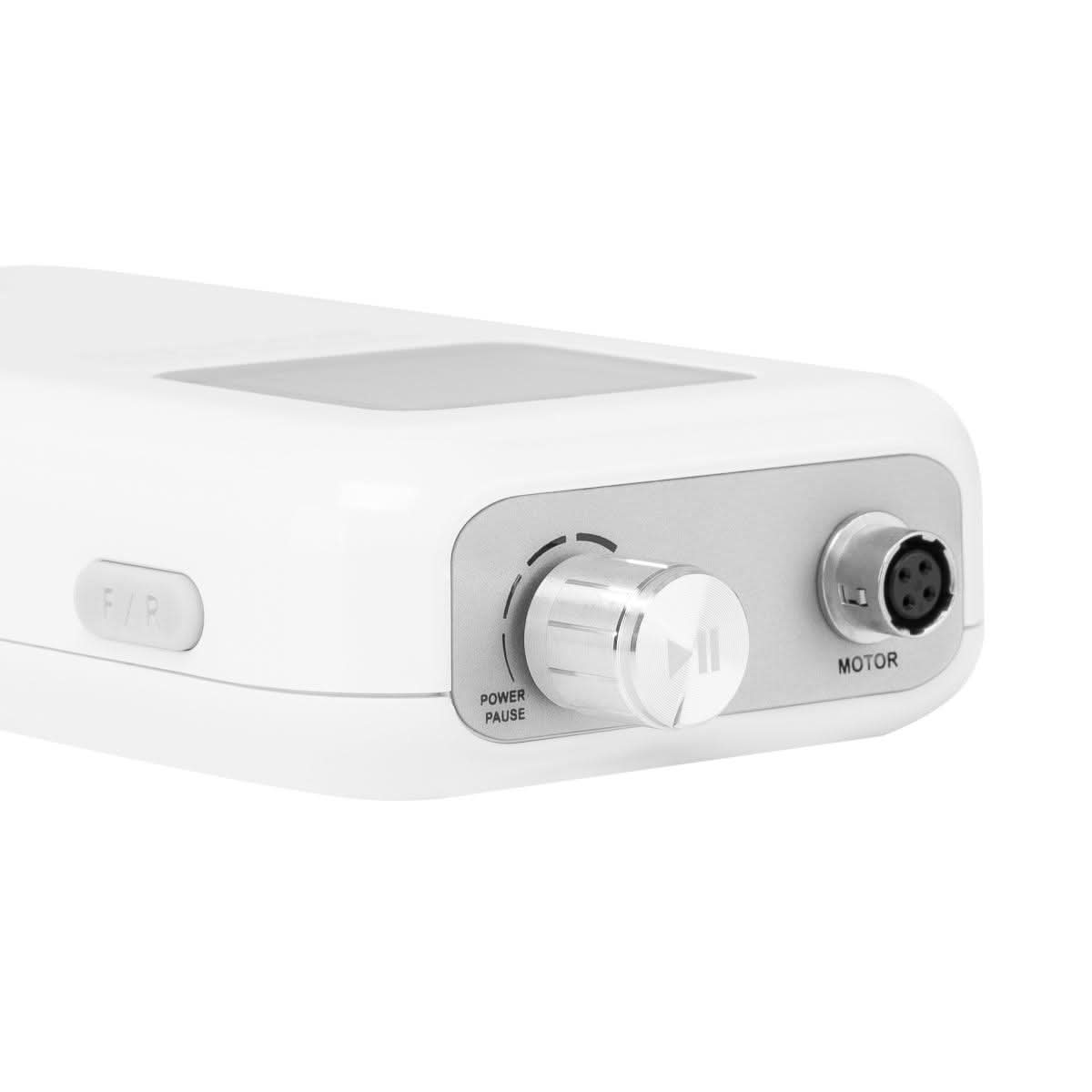 Простое управление позволяет плавно регулировать скорость вращения ручки, достигающую до 35 000 оборотов в минуту, что позволяет легко адаптироваться к индивидуальным потребностям и обеспечивает комфорт при выполнении различных процедур. Нажатие на ручку позволяет мгновенно остановить и возобновить работу аппарата (функция паузы), что обеспечивает полный контроль над рабочим процессом. Практичные кнопки, расположенные сбоку, позволяют быстро переключать ножной привод и менять направление вращения, что еще больше облегчает адаптацию аппарата к различным услугам. На экране отображается информация о направлении вращения, состоянии аккумулятора, активации ножного привода и активной паузе. Кроме того, аппарат оснащен защитой от перегрузки, которая предохраняет двигатель от перегрева и обеспечивает большую безопасность эксплуатации и долговечность оборудования.