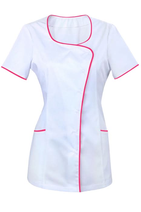 Белая туника с нежной розовой отделкой – это отличный выбор для косметологов, массажистов или сотрудников SPA. Классический цвет сочетается с женственными деталями, которые придают наряду мягкости и профессионализма.