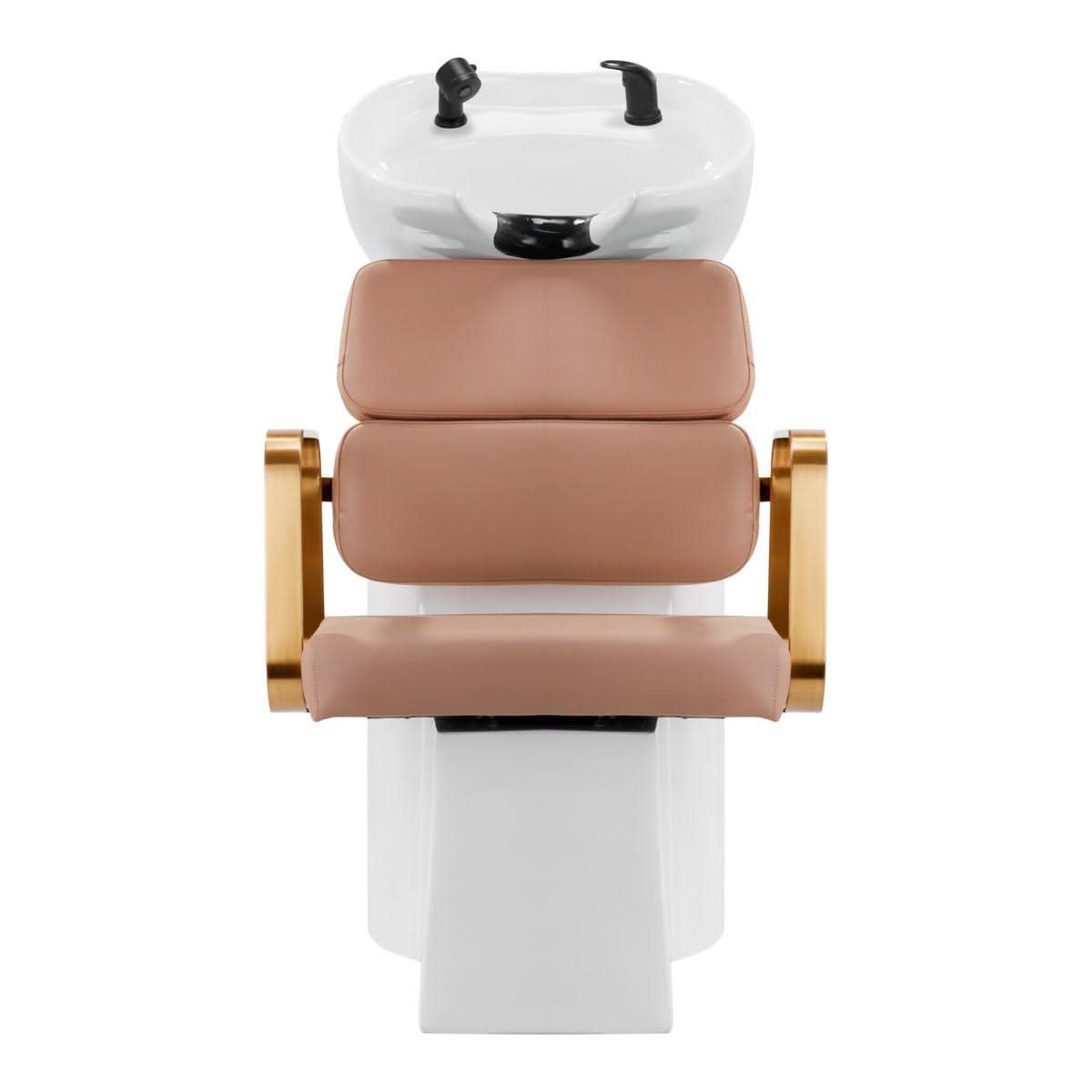 Профилированное кресло обеспечивает правильную поддержку поясницы, что способствует высокому уровню комфорта использования. Металлические подлокотники золотистого оттенка с геометрической формой позволяют правильно расположить плечи клиента. Наполнитель из прочного, устойчивого к деформациям пенополиуретана и обивка из приятной на ощупь искусственной кожи песочного оттенка обеспечивают долговечность мебели, легкий уход и комфортное использование в течение длительного времени. Оригинальная, элегантная мойка придает интерьеру уникальную выразительность. В комплект входят все детали черного цвета, включая смеситель, душ и специальные шланги, чтобы предоставить полный набор инструментов для работы.