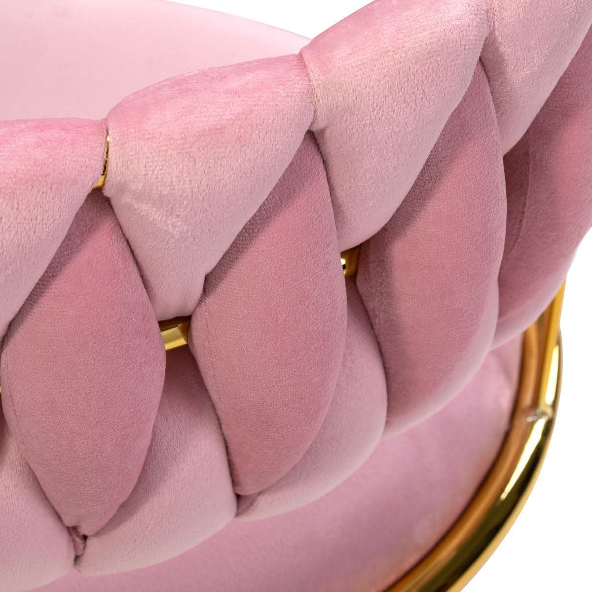 Благодаря изысканной отделке мебель привлекает внимание. Приятная на ощупь велюровая обивка розовых оттенков придает ей неповторимый характер. Основание золотистого оттенка добавляет элегантности, прекрасно сочетаясь с велюром. Функциональные колесики обеспечивают мобильность, облегчая перемещение стула и передвижение по помещению во время работы. Благодаря тщательной обработке, удобству использования и эстетично сплетенному материалу профилированной спинки, стул удовлетворит требованиям даже самых взыскательных пользователей.