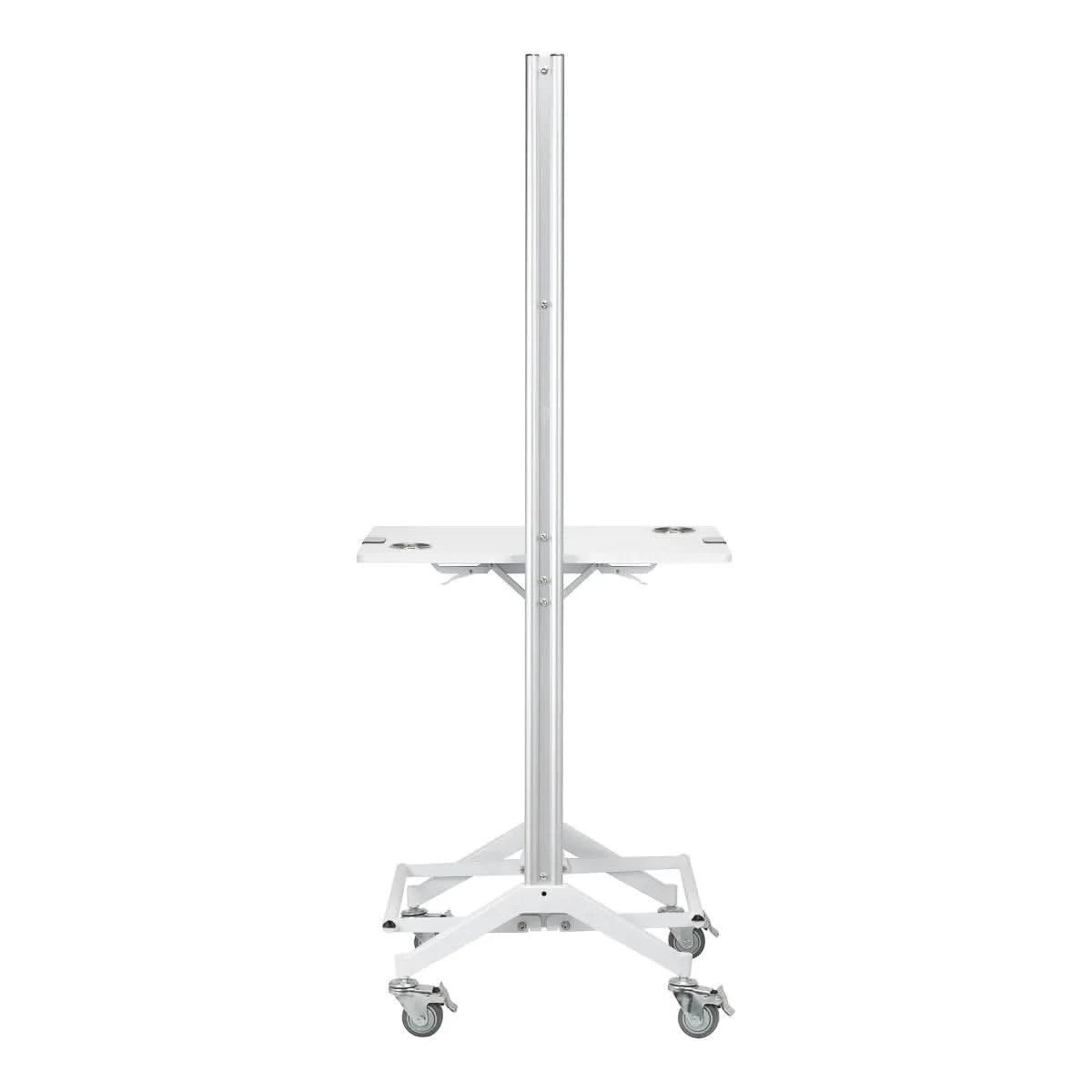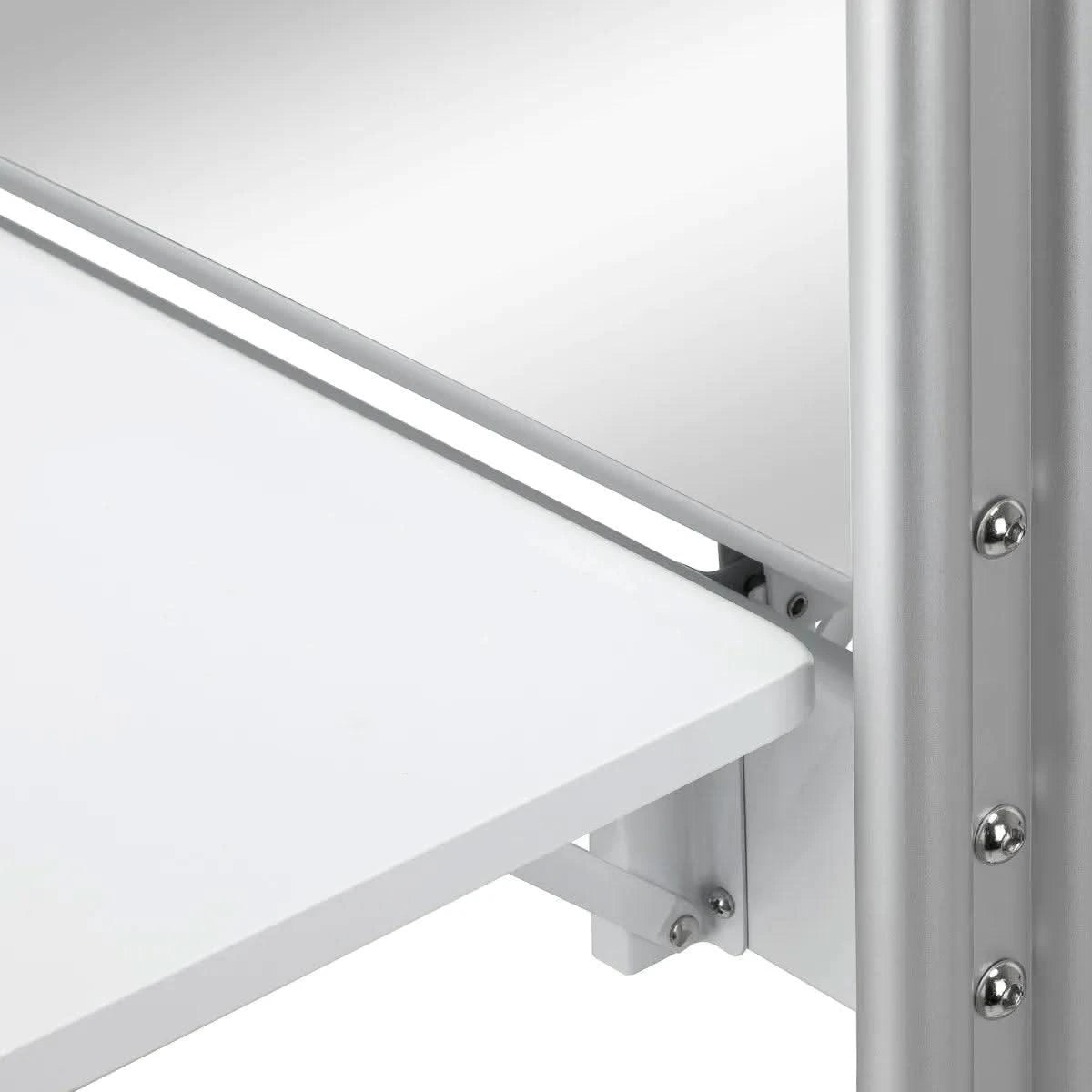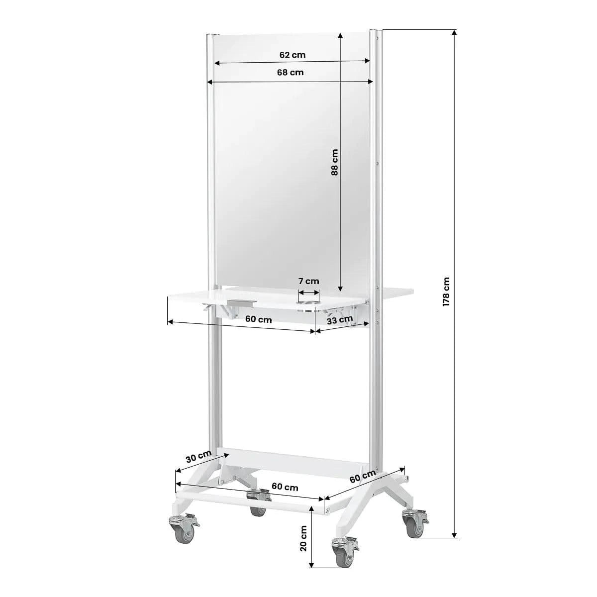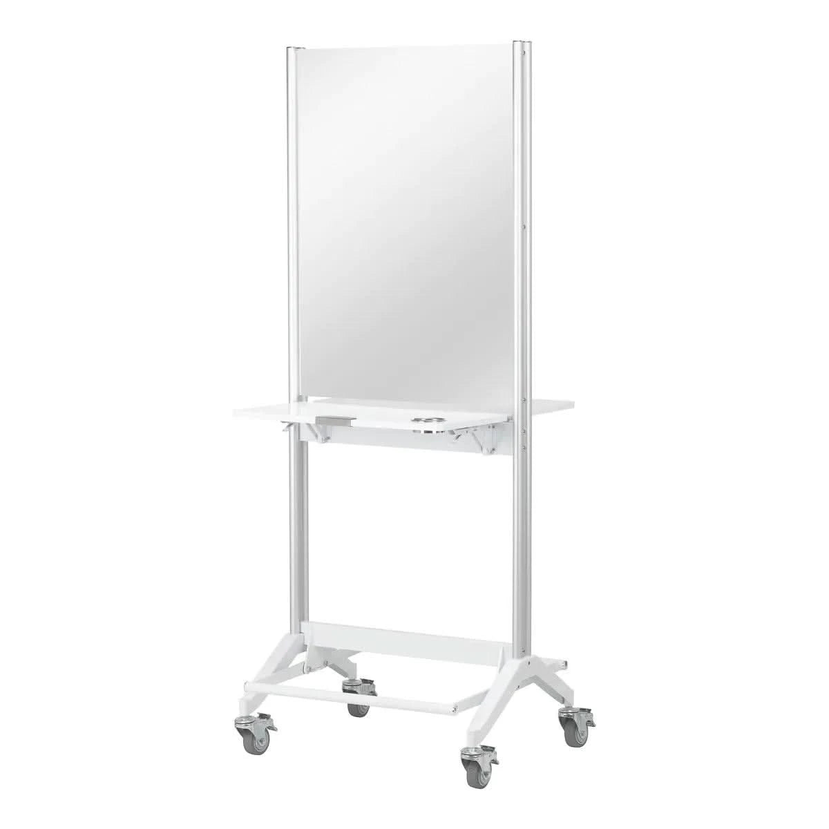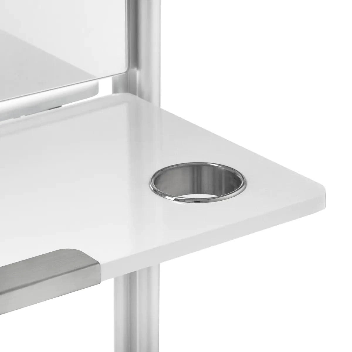 Практичная складная полка на высоте 90 см является одним из главных преимуществ консоли MI-03, позволяя экономить место и одновременно предоставляя функциональное пространство для хранения. Кроме того, двухсторонняя конструкция и блокируемые колесики обеспечивают мобильность и облегчают перемещение консоли. Отверстия в полке служат держателем для фена, что делает консоль еще более практичной и адаптированной к потребностям парикмахеров.