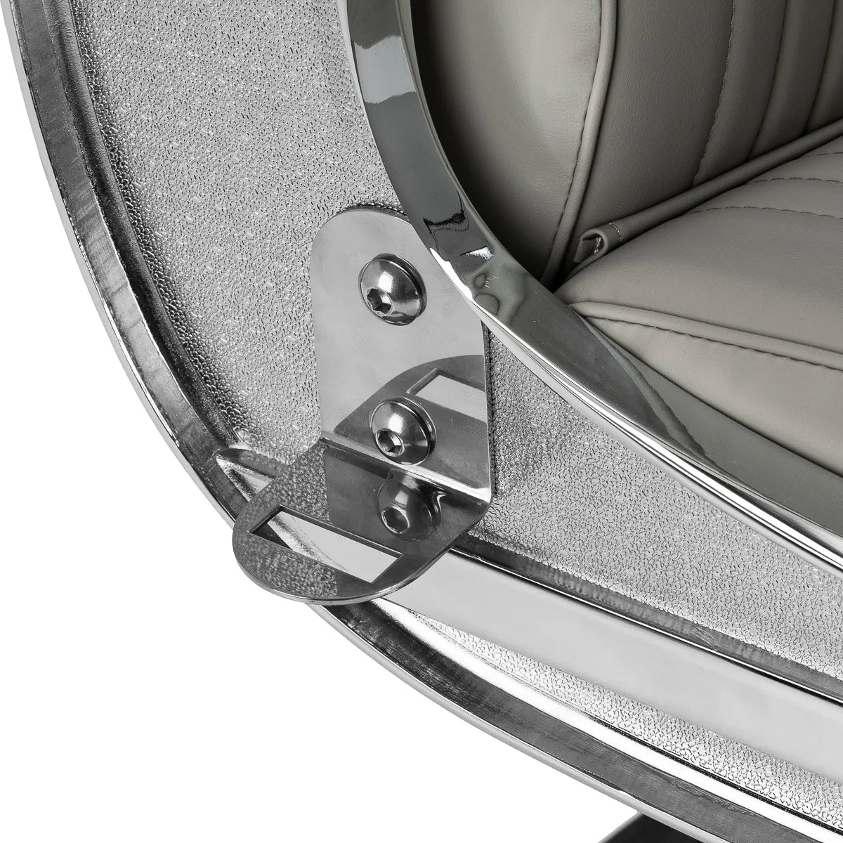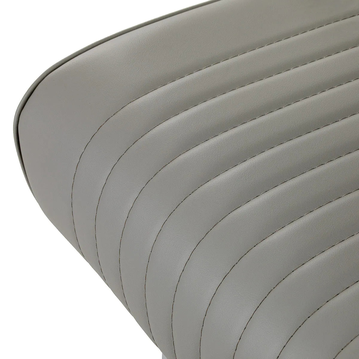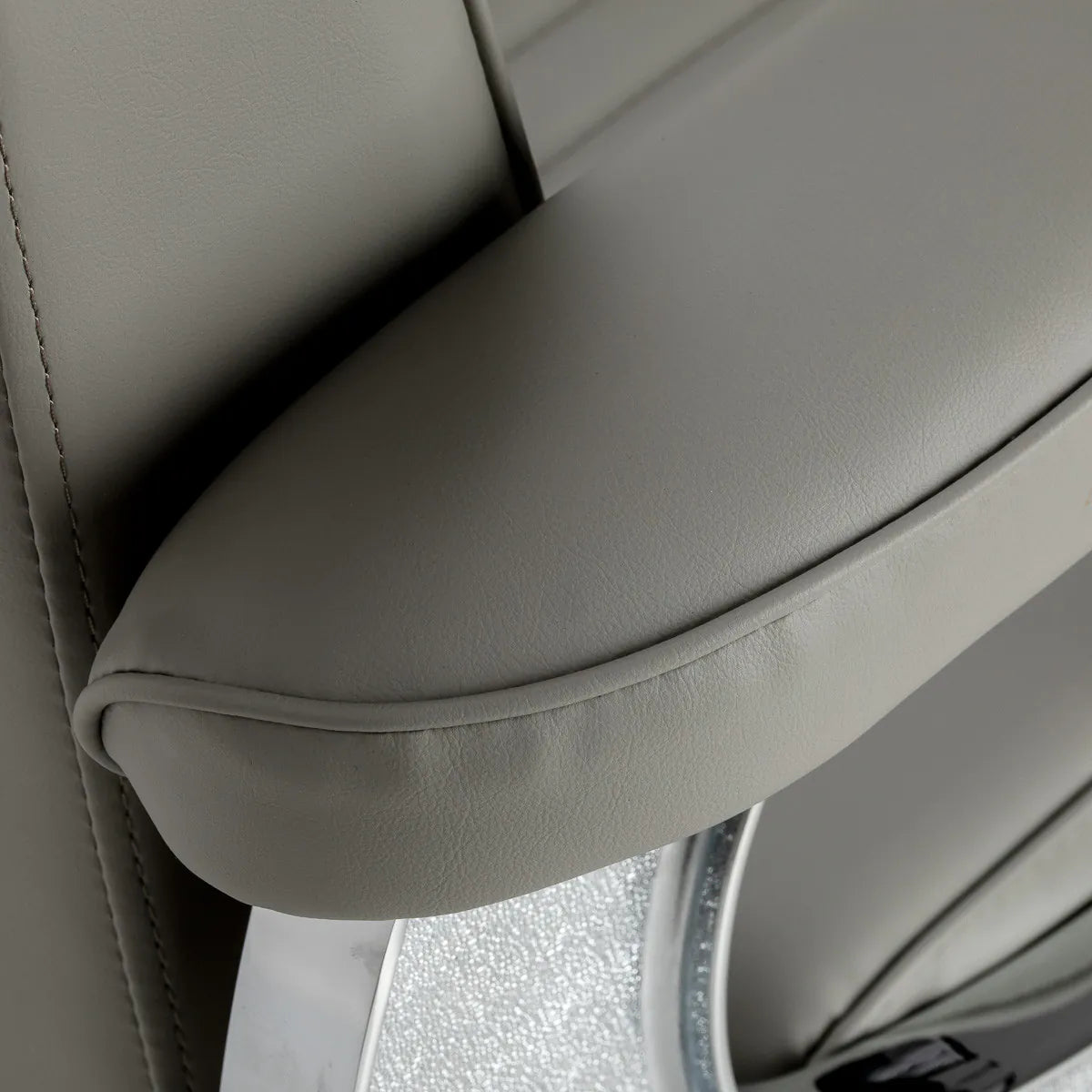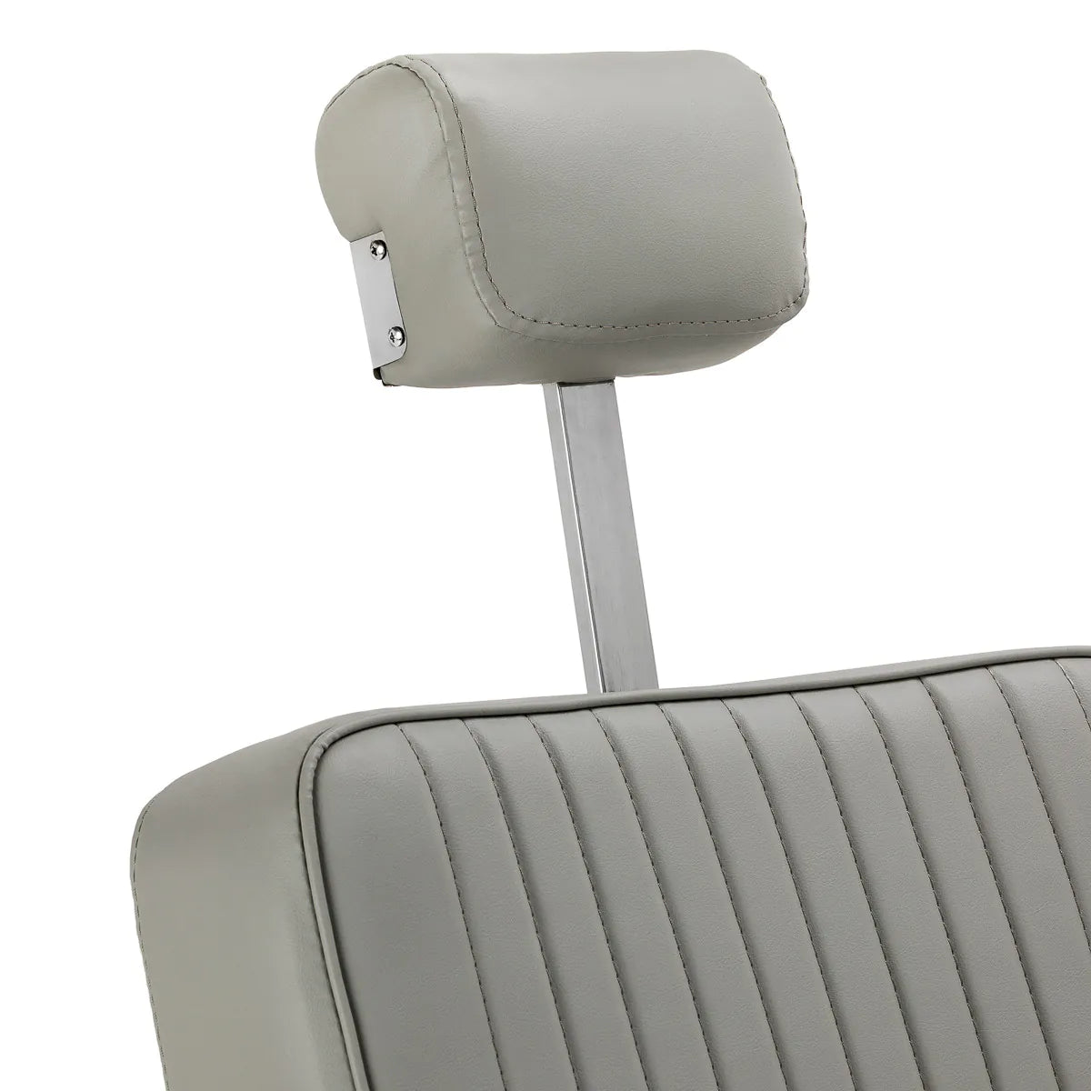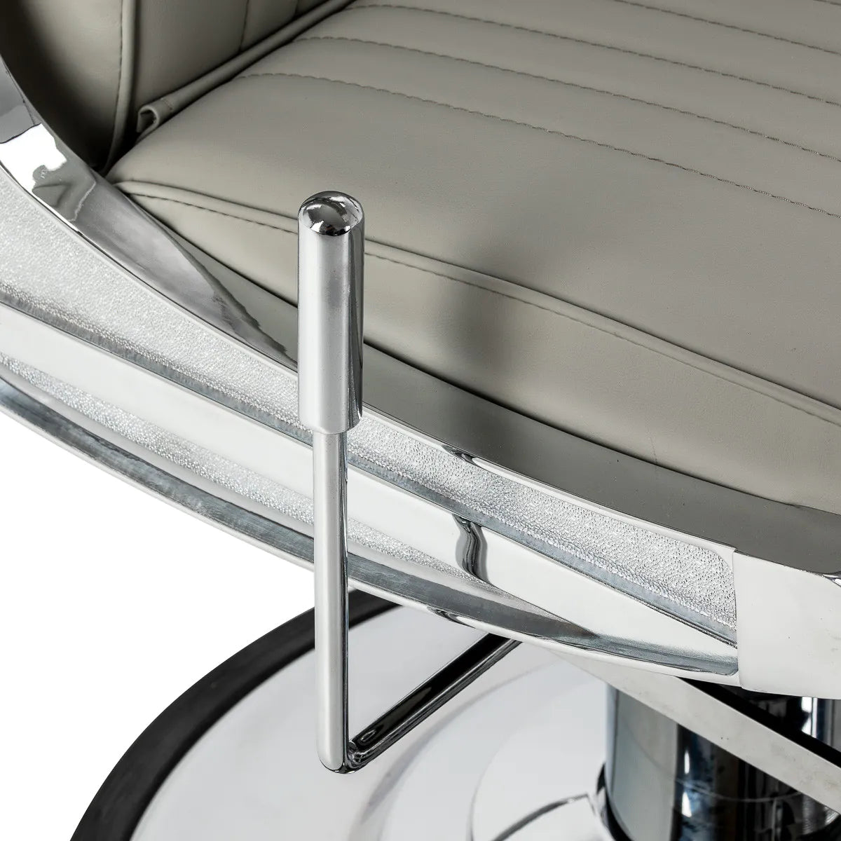 Tvirta pagrindo konstrukcija užtikrina stabilumą ir didelį komfortą. Sėdimoji dalis užpildyta deformacijai atsparia puta ir apmušta minkšta, matine sintetine oda, derinančia ilgaamžiškumą ir komfortą. Apdailai naudotos medžiagos yra atsparios drėgmei, ilgaamžės ir lengvai valomos, todėl kėdė puikiai tinka kasdieniam naudojimui. Stilingos siūlės ir pilkos spalvos apmušalas suteikia jai unikalų charakterį, puikiai derantį su modernių kirpyklų interjeru.